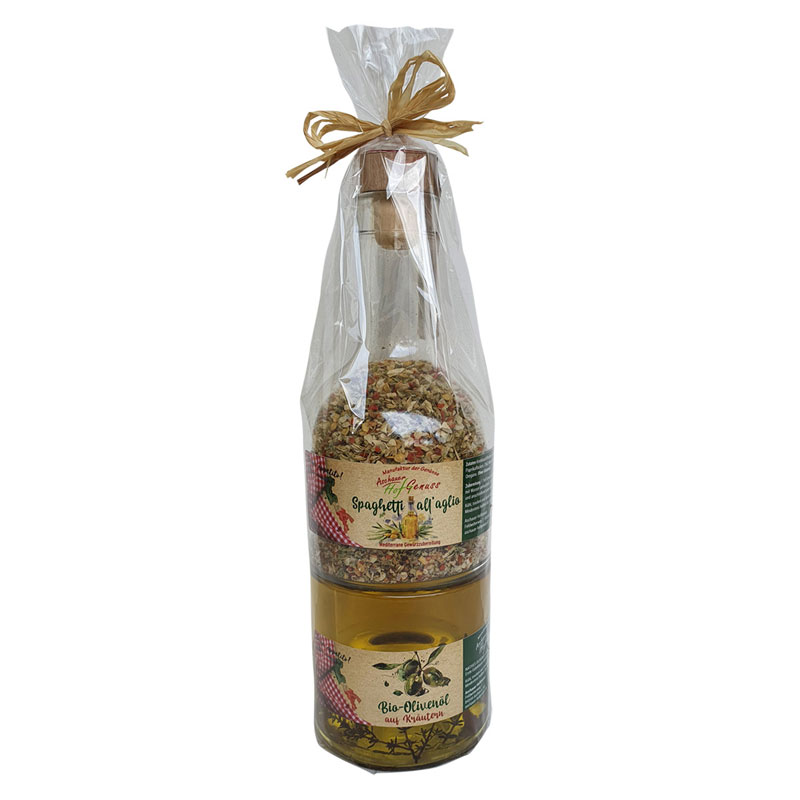 Unsere pikante Gewürzmischung Spaghetti all´Aglio und das Bio Olivenöl auf Kräutern haben wir als Stapelduo kombiniert.